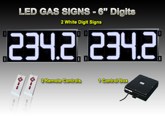 LED Digital Gas Price Changer package - 6" Character Height - Configuration:888.8 - 2-White LED Price Signs - Complete with Controller, Power supply & 2 RF Remote controls (1 remote control is an extra backup remote, in case there is ever a problem) - 140° Viewing Angle - The size of each sign is: - 21"(L) x 9" (H) x 2" (W)